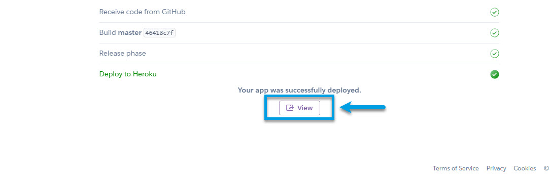 - Wait until the deploy process completes and click View if nothing happens click Manage App then upper right Open App