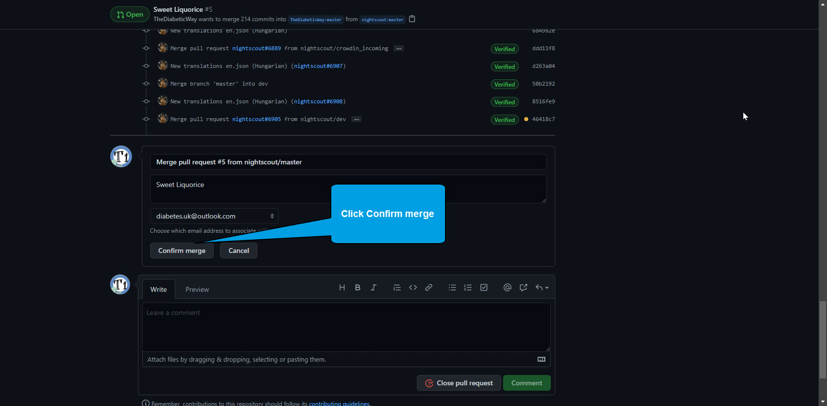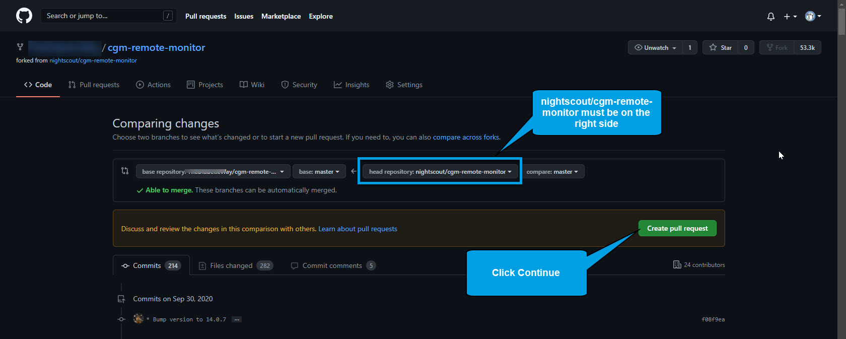 - Click "Create pull request” again, do not change the comparison. Your fork must be on the left side and the nightscout/cgm-remote-monitor must be on the right side.