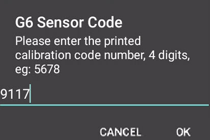 Once warm-up is complete, if you're using a G6 or Dexcom ONE, you will be asked to enter the sensor calibration code.