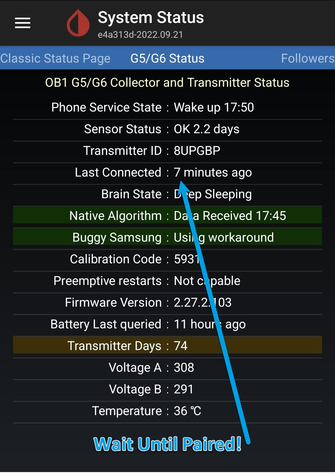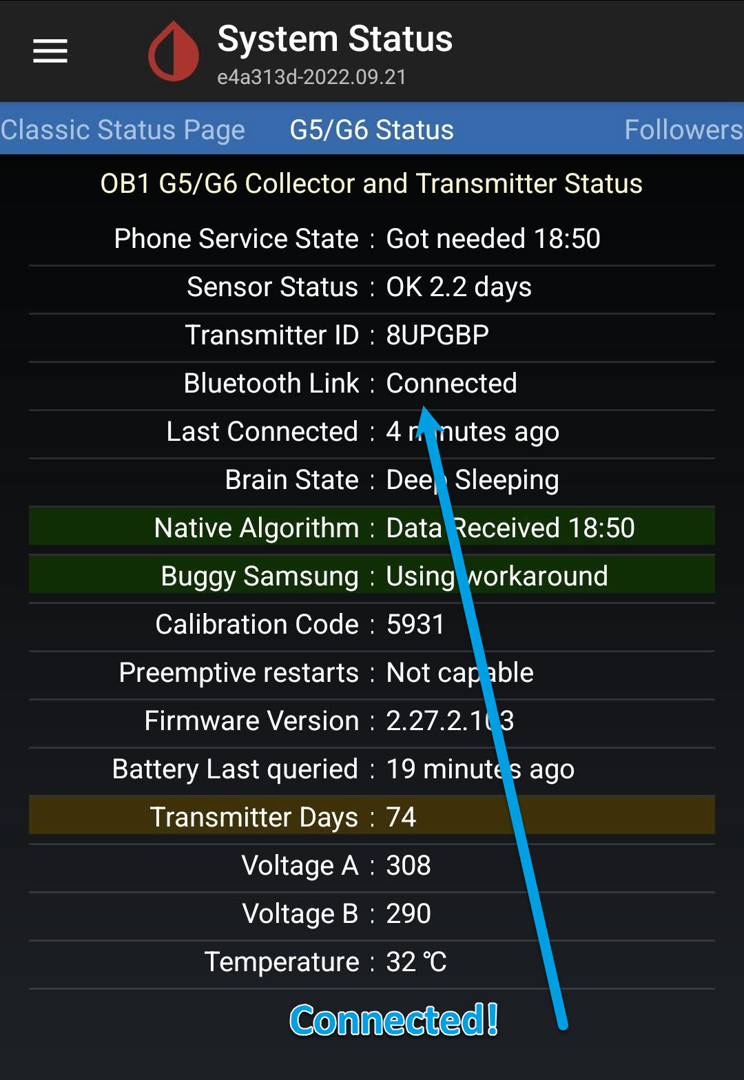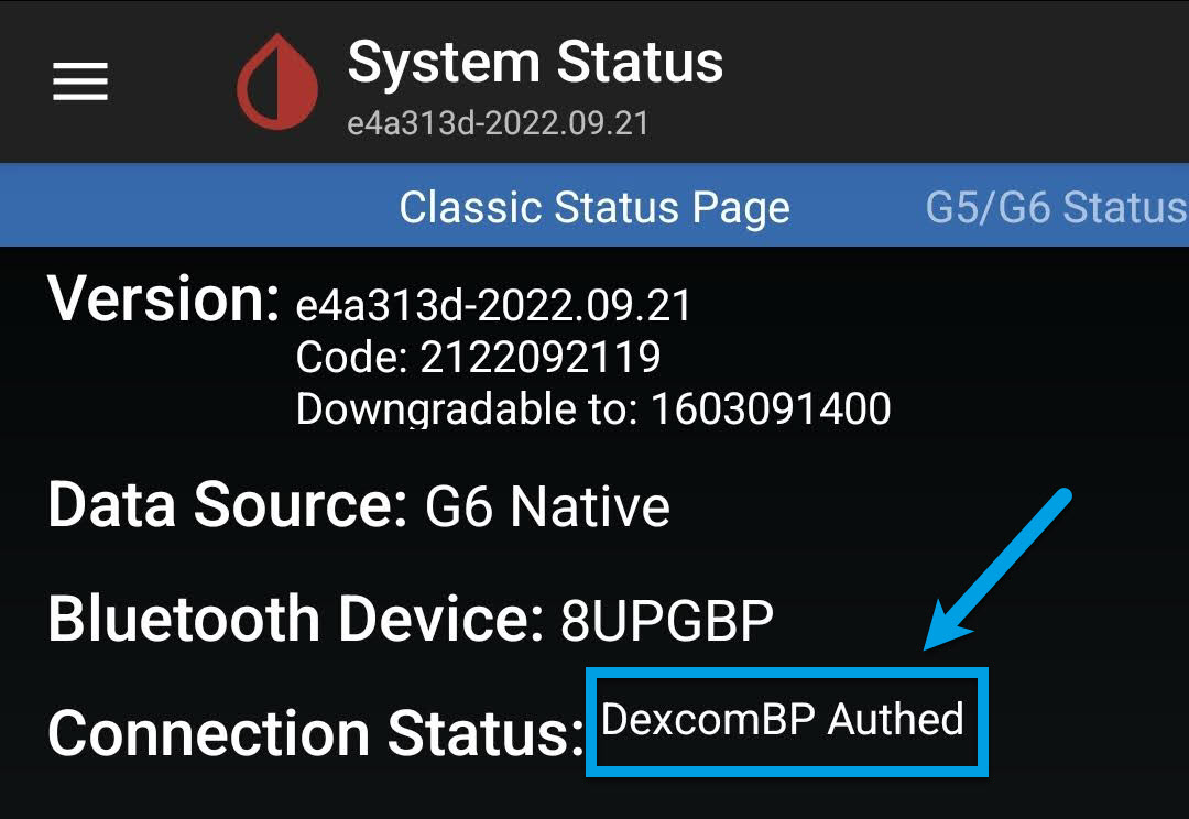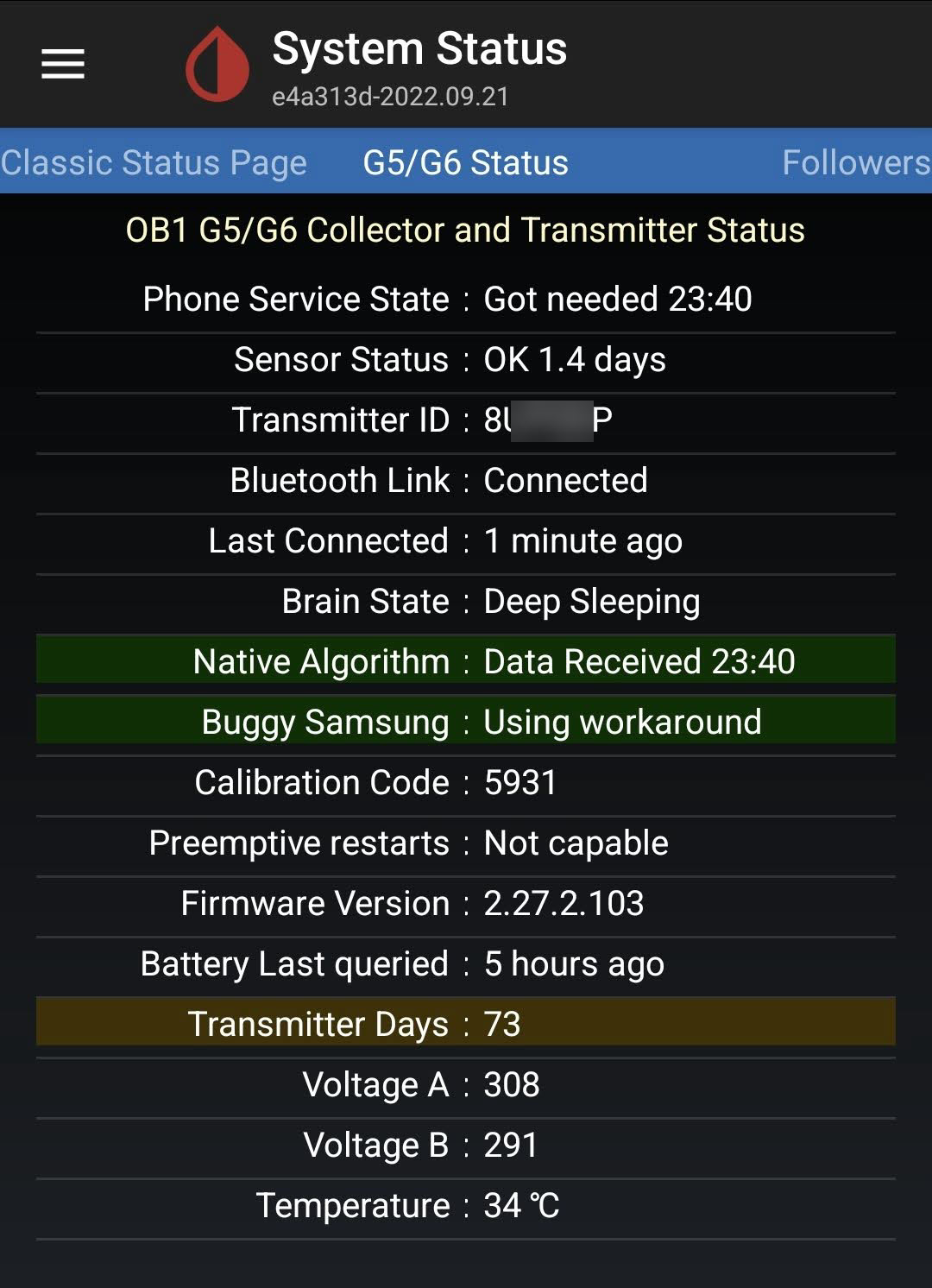 If you are using xDrip as the collector from Dexcom G5, G6 or Dexcom One, go to the G5/G6 status page with the “G5/G6 Status” heading.